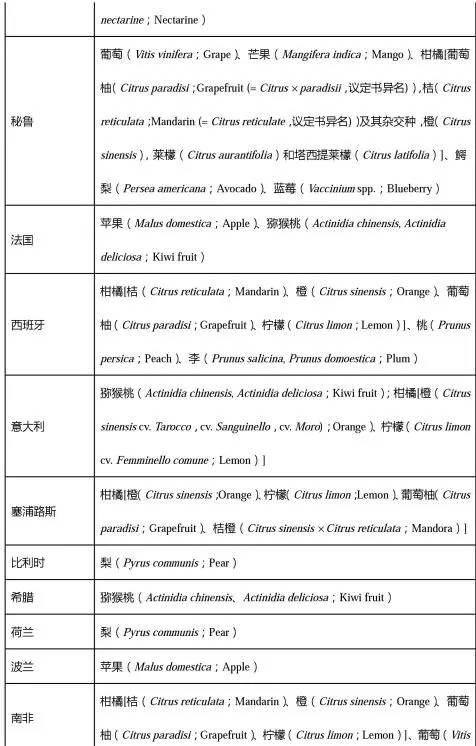同樣需要進行冷處理,技術指標為1℃及以下連續16天以上或者2.1℃及以下連續21天以上;每個包裝箱上應注明水果種類、國家、產地、果園、包裝廠等信息;每個托盤上或每個包裝箱上要有“輸往中華人民共和國”的中文字樣。