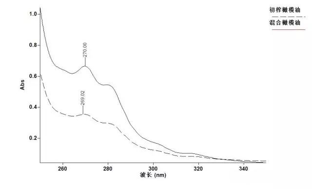 橄欖油中含有的某類(lèi)氧化物在270nm處有最大吸收波長(zhǎng)(見(jiàn)下圖),海關(guān)行業(yè)標(biāo)準(zhǔn)HS/T 57—2017《橄欖油消光系數(shù)(K270)的測(cè)定方法》就是利用初榨橄欖油中氧化物含量較低,而經(jīng)過(guò)加熱、脫色和脫酸等精制工序處理后的橄欖油中氧化物含量較高,通過(guò)測(cè)量一定濃度下橄欖油樣品在270nm紫外吸光度,鑒別初榨橄欖油與其他橄欖油。