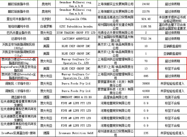 2批次來自標(biāo)稱澳大利亞進(jìn)口的德運(yùn)Devondale奶粉(全脂高鈣奶粉1kg以及脫脂高鈣奶粉1kg)。其生產(chǎn)企業(yè)為Murray Goulburn Co-Operative Co.,LTD,未予準(zhǔn)入的原因是產(chǎn)品超過保質(zhì)期。