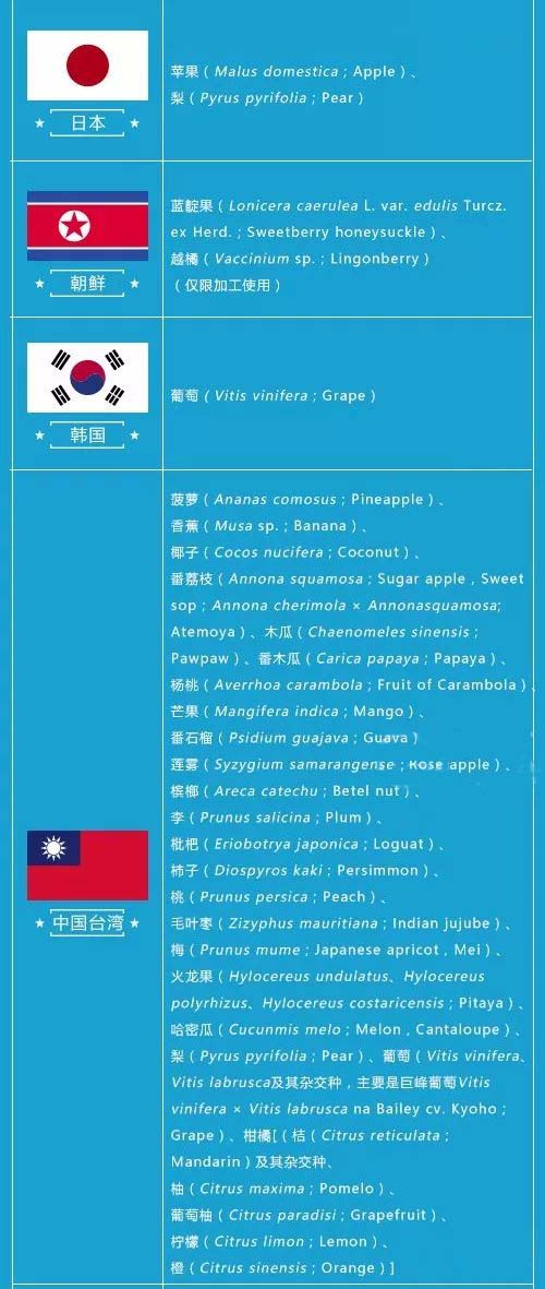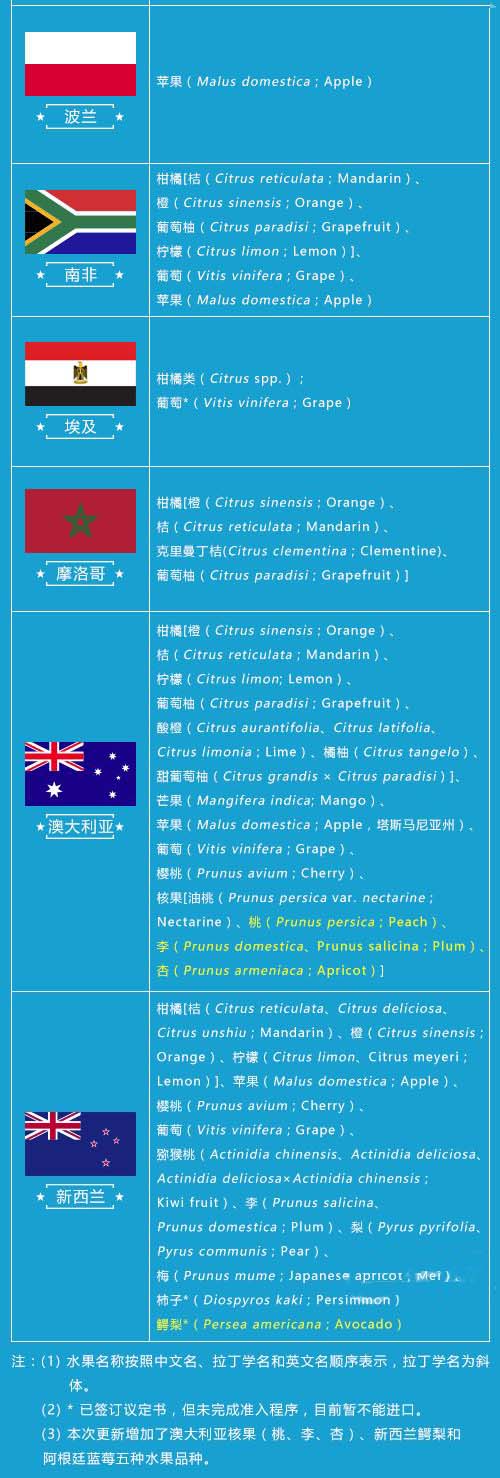 博裕食品進口報關行獲悉,近日,國家質檢總局官網更新2018年進口水果準入名單,博雋進口了解到這是今年第一次更新的進口水果準入名單。在本次更新名單中的有:澳大利亞桃(Prunus persica;Peach)、李(Prunus domestica、Prunus salicina;Plum)、杏(Prunus armeniaca;Apricot)、新西蘭牛油果(Persea americana;Avocado)、以及阿根廷藍莓(Vaccinium spp.;Blueberry)。
