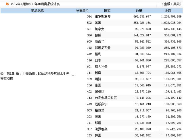 博裕食品進口報關行了解到,截至2017年10月,我國共進口海產品總量超過237萬噸,總額超過2334萬美元。按國家分類,俄羅斯、美國、加拿大、挪威、新西蘭為中國進口海產的前五名。